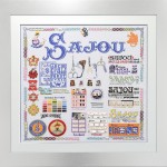 パリの 『 L'aiguille en Fete 針の祭典 』 へ行った時に会場で購入したチャートの一つ、Les Brodeuses Parisiennes のものです。会場には素敵なキットやチャートが限りなくあって、舞い上がってしまいました。 チャートのままアルファベットを全部刺しましたので、下の部分の左右に空間があります。そこにSewing にちなんで可愛いカラフルなボタンをたくさん留め付けました。